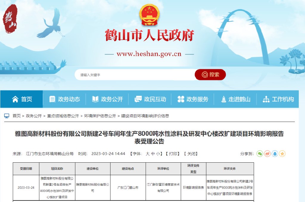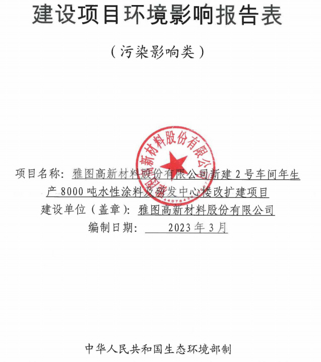 (二)据江门市生态环境局鹤山分局发布于2023年4月23日的《关于雅图高新新建2号车间年生产8000吨水性涂料及研发中心楼改扩建项目环境影响评价文件审批的公告》(以下简称“8000吨水性涂料环评批复”),环评审批号为江鹤环审[2023]35号。截至环评报告的编制日2023年2月7日,雅图高新现全厂产能为年产溶剂型汽车涂料3,0000吨、水性汽车涂料15,000吨、水性工业涂料15,000吨。
