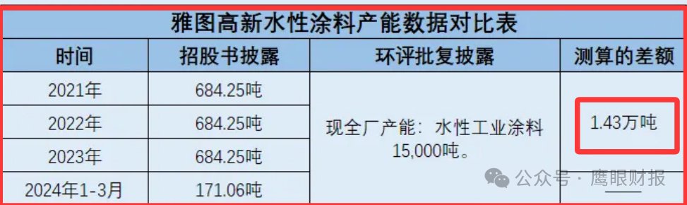惊天差别:雅图高新水性涂料现有产能(684万)与环评产能(1.5万吨)差额高达1.43万吨,按前者产能利用率70%,按后者呢?
