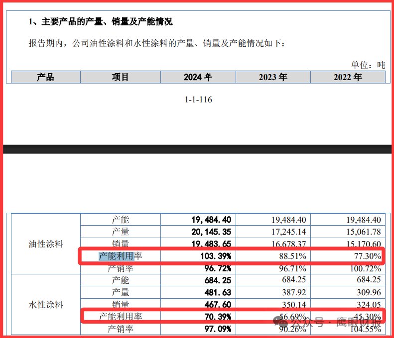 数据显示,2023年公司水性涂料销量仅350吨,而油性涂料销量高达1.67万吨。水性涂料虽环保但成本高,终端用户需额外配备烤房、水性喷枪等设备,市场接受度仍有限。如此激进的产能扩张,市场能否消化,确实要打上一个大大的问号。
